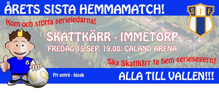 Det börjar dra ihop sig i div 5 östra Värmland och med 2 omgångar kvar ser det ut enligt följande i toppen. 1.Skattkärr 44 poäng 40 + mål 2.Hammarö 43 poäng 20 + mål 3.Skoghall 41 poäng 43 + mål Skattkärr 4:a Immertorp hemma 10:a Woodys borta Hammarö 6:a Råtorp borta 5:aNorrstrand hemma Skoghall 11:a Hertzöga 2 hemma 8:a Grums Borta Vi har alltså skaffat oss ett superläge inför avslutningen. Det har på många sätt varit en tuff säsong med väldigt mycket skador och indisponibla spelare under året. Tycker ändå vi varit hyfsat stabila och det är därför vi ligger där vi gör nu. Vi har värvat kanoninsatser med mindre bra insatser. Råtorp hemma, Hammarö borta är två svaga insatser. Våra toppmatcher är Skoghall hemma 7-2, även riktigt bra mot Skoghall borta(0-0). Gjorde allt rätt utan mål i den matchen. Sifhälla borta där vi vinner med 6-0 trots 10 man i 88 minuter är något som man minns. Nu skall det alltså avgöras, vi har inte vunnit något ännu och det krävs 110 % insatser i de två sista matcherna för att det skall gå vägen. Men vi är redo.... Nu på fredag väntar alltså Immetorp hemma på Calands Arena klockan 19:00. Har ni inget för er så kom ut och visa ert stöd. Vi uppskattar det oerhört mycket.