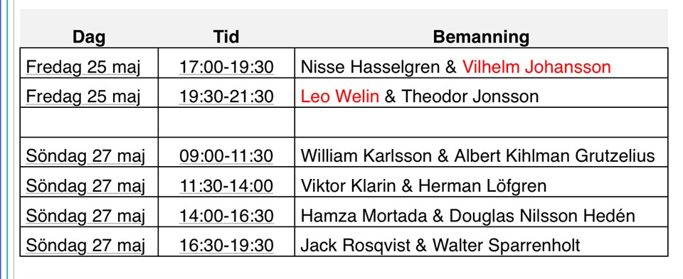 Schema för bemanning av kiosken v 21 Om inte din tid passar får man byta med annan ”kioskkompis” (Skriv då i kommentatorsfältet, ge då också minst ett förslag på andra möjliga tider) Ledarfamiljerna är undantagna från kioskansvar Vi kommer även ha ansvar för kiosken i höst om det är någon som blev utan pass den här omgången. Checklista Kioskfo¨rsa¨ljning Schema för bemanning av kiosken v 21 Vänlig hälsingar Britt-Inger (Viktors mamma) och Sandra (Valters mamma) Dag Tid Bemanning Fredag 25 maj 17:00-19:30 Nisse Hasselgren & Vilhelm Johansson Fredag 25 maj 19:30-21:30 Leo Welin & Theodor Jonsson Söndag 27 maj 09:00-11:30 William Karlsson & Albert Kihlman Grutzelius Söndag 27 maj 11:30-14:00 Viktor Klarin & Herman Löfgren Söndag 27 maj 14:00-16:30 Hamza Mortada & Douglas Nilsson Hedén Söndag 27 maj 16:30-19:30 Jack Rosqvist & Walter Sparrenholt (det kan bli ändringar i spelschemat, meddelas i så fall så snart vi fått information)